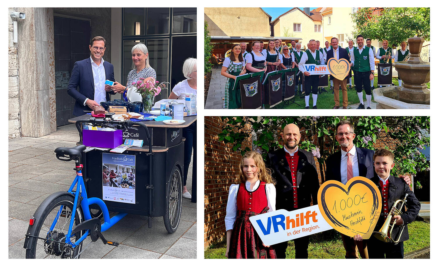 Die Spendenübergaben (im Uhrzeigersinn v. li.). Spende an den Caritasverband für die Stadt und den Landkreis Schweinfurt (v. li.): Frank Hefner (Vorstandssprecher VR-Bank Main-Rhön) und Heide Wunder (Kontaktstelle Ehrenamt Stadt Schweinfurt). Spende an die Rhönmusikanten Waldberg (v. li.): Edmund Bühner (Erster Vorsitzender Rhönmusikanten Waldberg), Hans-Peter Suckfüll (Spendenbotschafter VR-Bank Main-Rhön) und Markus Arnold (Dirigent). Spende an den Musikverein Herschfeld (Bildmitte, v. li.): Mona Hohmann, Stephan Hellmuth (Erster Vorsitzender Musikverein Herschfeld), Hans-Peter Suckfüll (Spendenbotschafter VR-Bank Main-Rhön), Kilian Hellmuth.