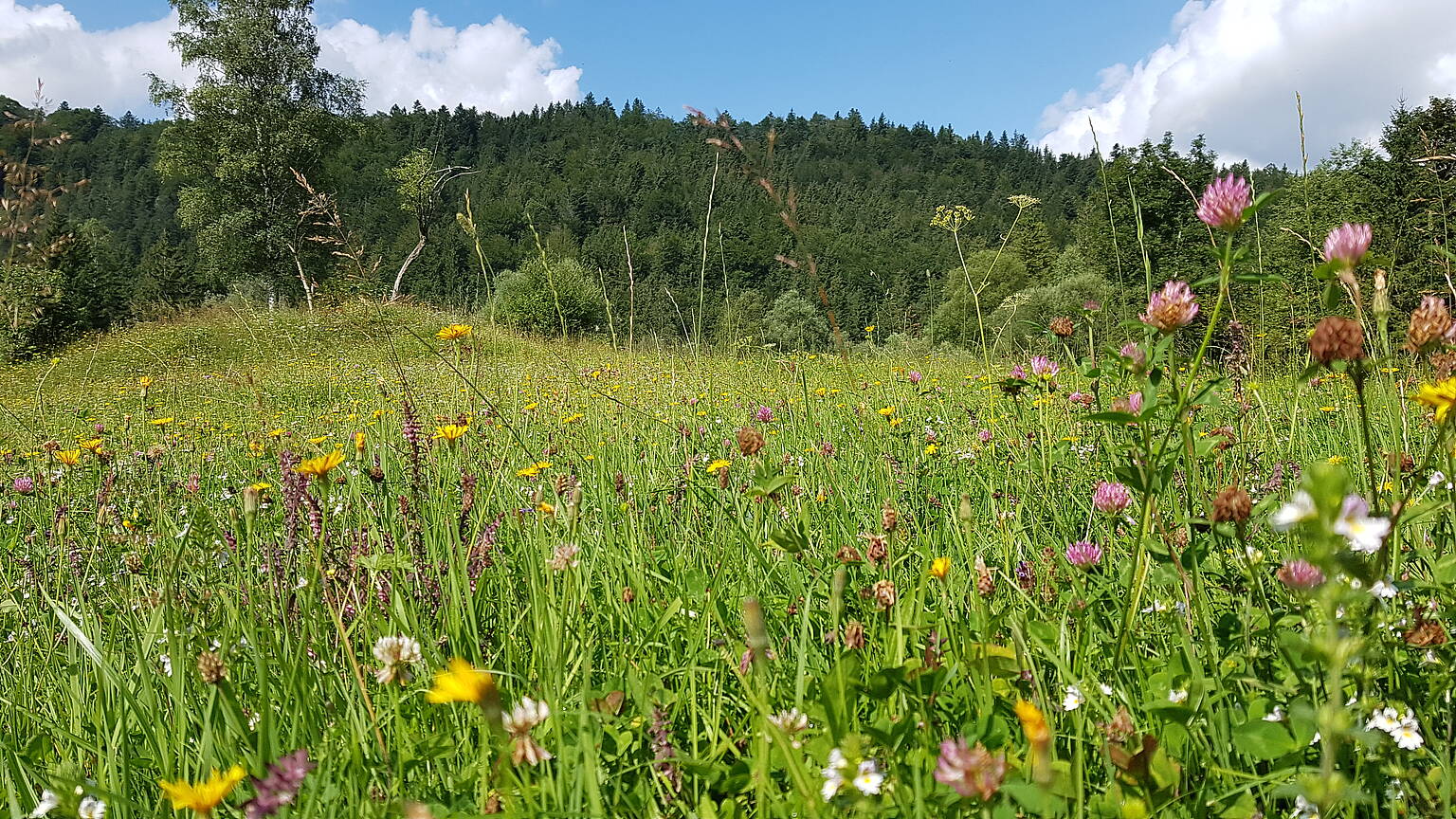 Extensiv bewirtschaftet und deshalb artenreich: Auch rund um den Isar-Stausee beweidet die Forst- und Weidegenossenschaft Krün ausgedehnte Flächen vor allem im Frühjahr und im Herbst. Weil das Vieh nur zeitweise auf den Wiesen weidet, werden Trittschäden vermieden.