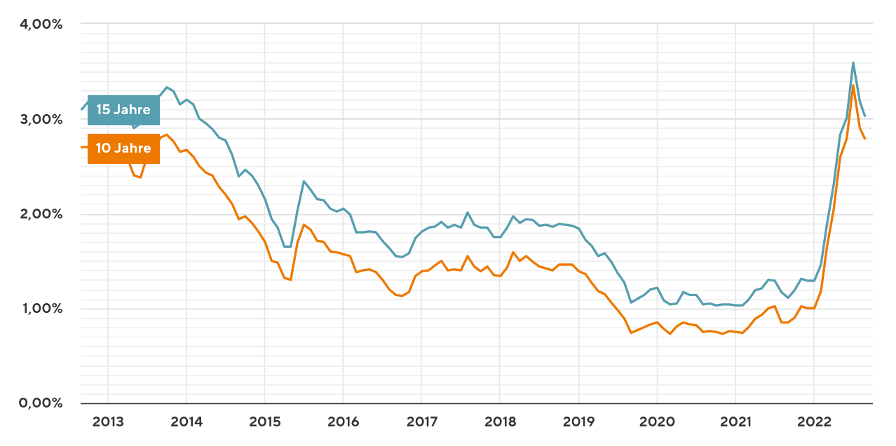 Ab 2022 geht es steil nach oben: Die Zinsentwicklung für Immobilienkredite (Laufzeit über 10 und 15 Jahre) der vergangenen zehn Jahre. Quelle: Interhyp