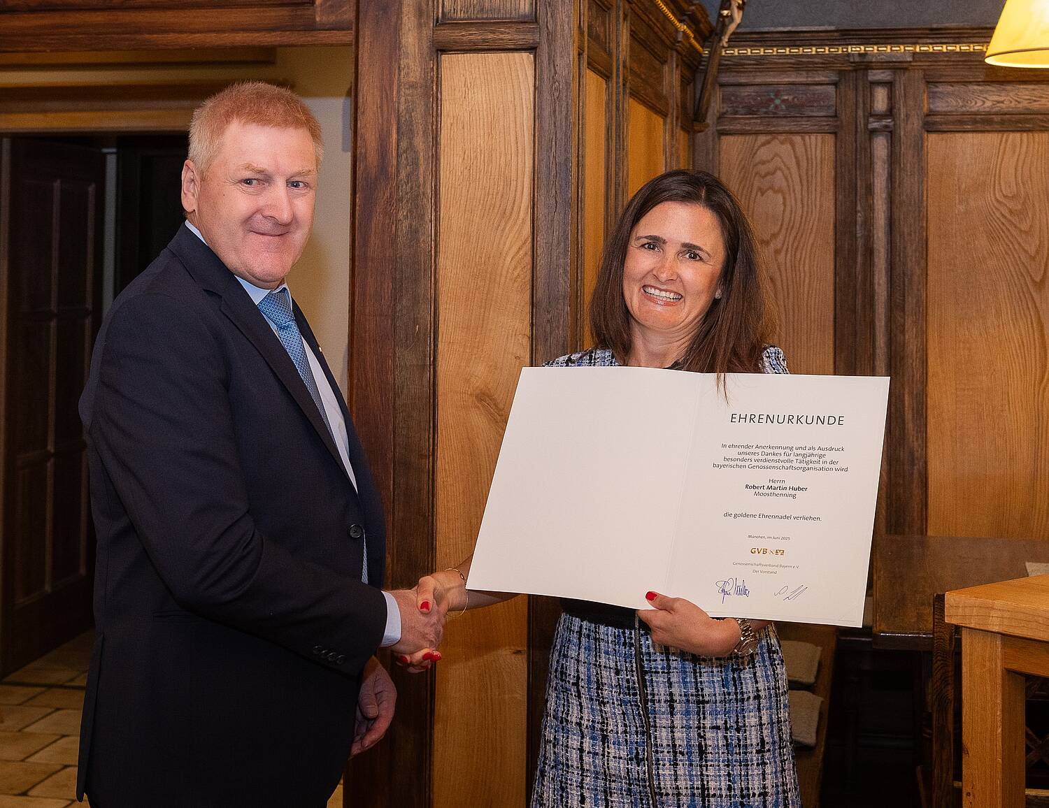 Drei Jahrzehnte lang hat Robert Huber die Entwicklung der VR-Bank Landau-Mengkofen im Aufsichtsrat begleitet und geprägt. Nun wurde er feierlich verabschiedet. Carolin Vogl, Leiterin Prüfung Banken beim Genossenschaftsverband Bayern, würdigte Huber mit der höchsten Auszeichnung des Verbands, der Goldenen Ehrennadel. In ihrer Laudatio betonte sie: „Sie haben Verantwortung getragen – mit ruhiger Hand, klarem Blick und einem tief verankerten Pflichtgefühl.“ Huber trat in der damaligen Raiffeisenbank Mengkofen in den Aufsichtsrat ein, in seine Amtszeit fielen zwei Fusionen, die Umsetzung einer zukunftsorientierten Filialstrategie, die Neuausrichtung im Versicherungsgeschäft, und die Sicherung des Warengeschäfts. Außerdem hat er fünf Vorstandsbesetzungen maßgeblich begleitet. Aufsichtsratsvorsitzender Josef Wallinger hob in seiner Rede die persönliche Haltung Hubers hervor: „Du warst kein Mann vieler Worte, aber ein Mann mit Haltung und Überzeugung. Deine Ruhe und Deine Bodenständigkeit haben unser Gremium geprägt.“ Die Bank habe sich seit Hubers Amtsantritt eindrucksvoll entwickelt. Aus einer Bilanzsumme von damals 93 Millionen Euro sind heute über 1,6 Milliarden Euro geworden. Die Mitarbeiterzahl stieg von unter 40 auf fast 500 in der gesamten Unternehmensgruppe. Gesundheitliche Gründe haben Robert Huber zu seinem Rückzug bewogen. Zum Abschied erhielt er neben der Auszeichnung auch den Dank seiner Weggefährten. „Vergelt’s Gott, lieber Robert – für alles“, so Wallinger zum Schluss.