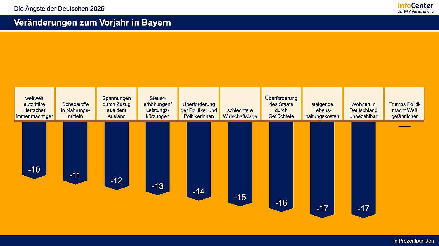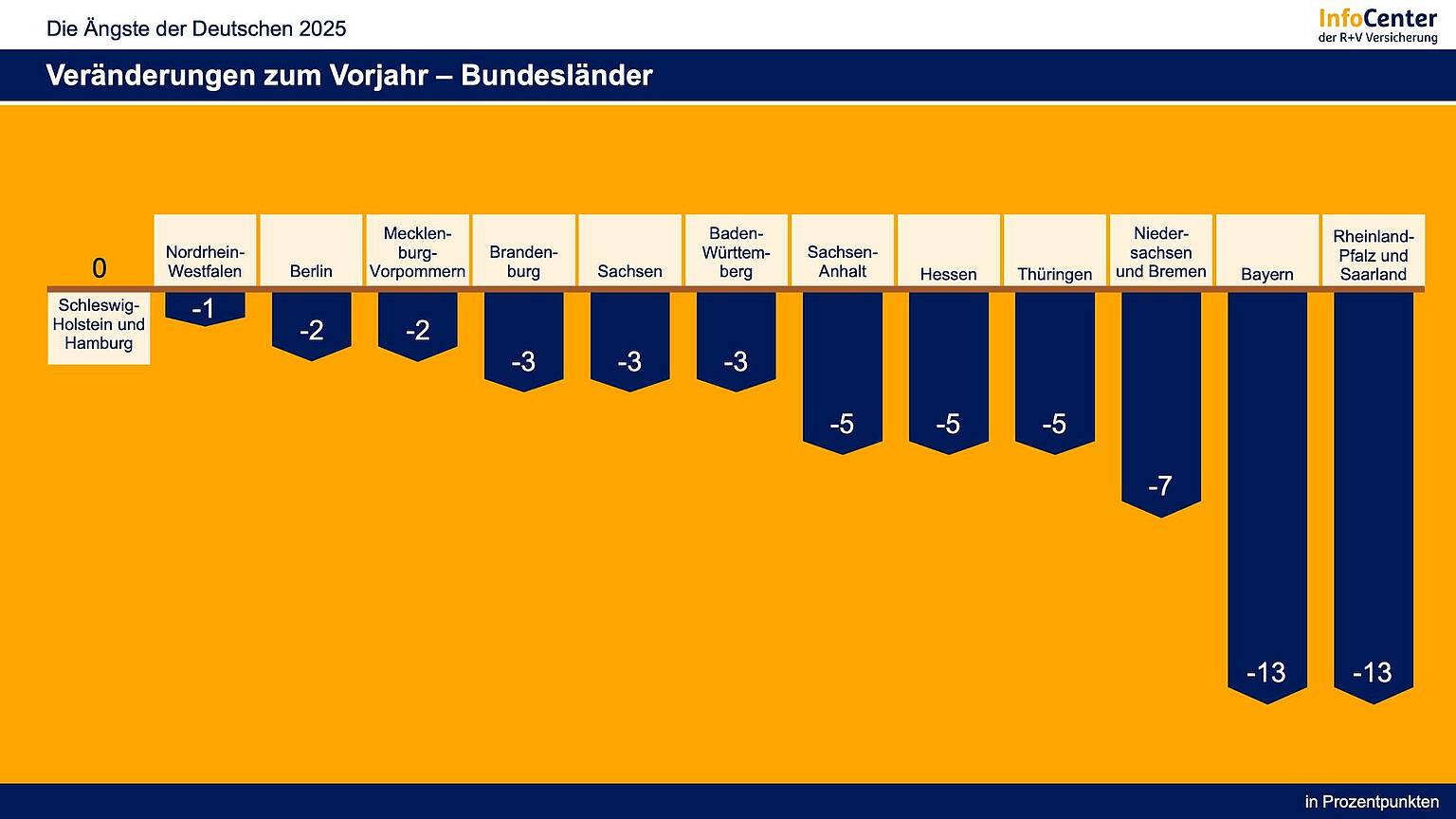 Im Vergleich aller Bundesländer sind in Bayern, im Saarland und in Rheinland-Pfalz die Sorgen im Vergleich zum Vorjahr am stärksten zurückgegangen. Grafik: R+V
