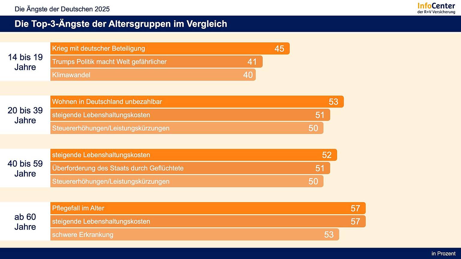 Was ist die größte Angst? 2025 geben Jung und Alt unterschiedliche Antworten. Nur bei den jüngsten Befragten ist die Furcht vor einem Krieg mit deutscher Beteiligung die Top-Angst. Für die Befragten im Alter von 20 bis 39 Jahren steht die Sorge ganz oben, dass Wohnraum unbezahlbar wird. Auf Platz 1 bei den 40- bis 59-Jährigen ist die Angst vor steigenden Lebenshaltungskosten. Eine Sorge, die nur die Gruppe 60+ bewegt: im Alter pflegebedürftig zu werden. Hier landet diese Angst auf dem Spitzenplatz. Grafik: R+V