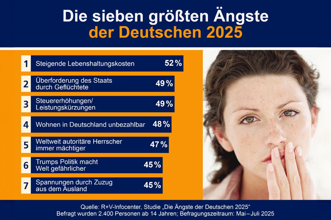 Reicht mein Geld auf Dauer zum Leben? Nein, fürchten die Deutschen. Die Mehrheit (52 Prozent) glaubt, dass die Lebenshaltungskosten immer weiter steigen. Das ist das Kernergebnis der Studie „Die Ängste der Deutschen 2025“ des Infocenters der R+V. „Obwohl die Inflation abgeflacht ist, bleibt sie für die Deutschen ein Schreckgespenst. Sie spüren deutlich, wie die Preise für Energie, Nahrungsmittel und Dienstleistungen weiter anziehen“, sagt der Studienleiter und Leiter der Konzern-Kommunikation, Grischa Brower-Rabinowitsch. „Die Angst vor steigenden Lebenshaltungskosten belegt schon zum 15. Mal Platz eins der Studie.“ Insgesamt dominieren in diesem Jahr finanzielle Themen: Auf Platz drei liegt die Angst vor Steuererhöhungen oder Leistungskürzungen (49 Prozent), auf Platz vier folgt die Furcht vor unbezahlbarem Wohnraum (48 Prozent). Aber auch politische Sorgen spielen 2025 eine wichtige Rolle.