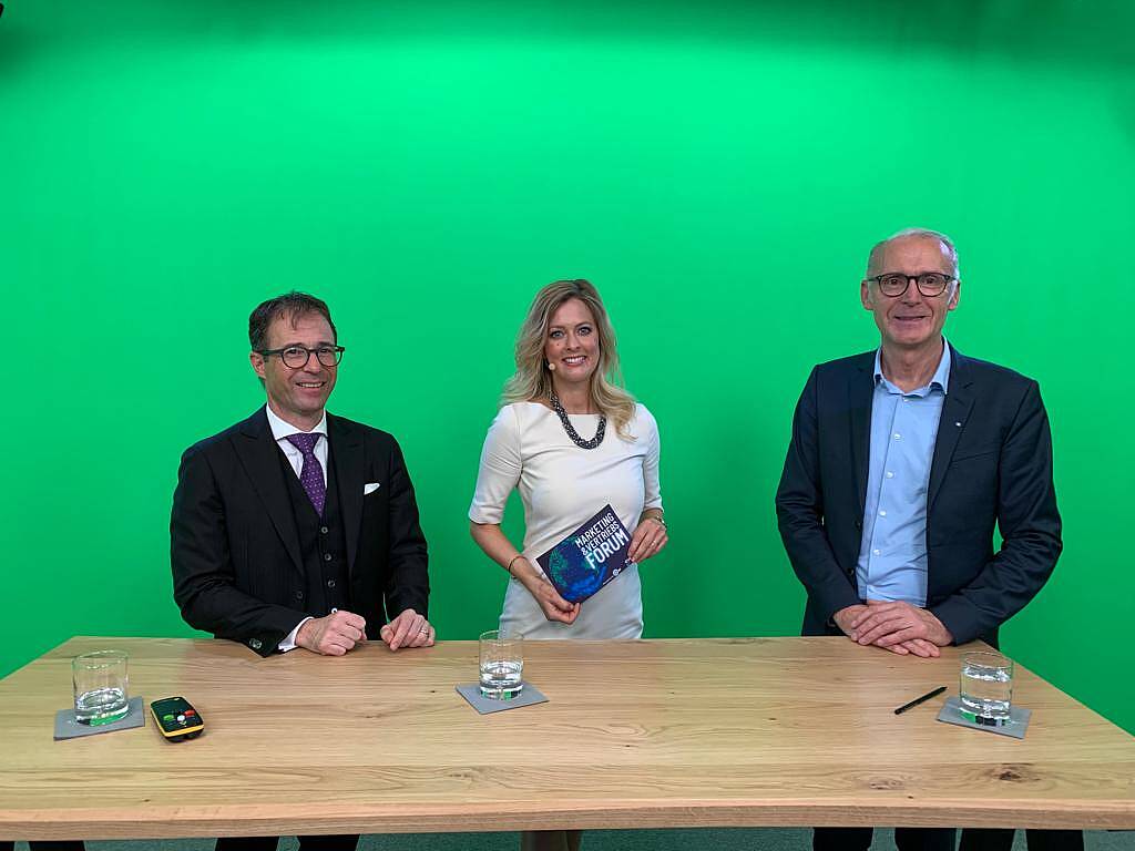 Premiere für das neue GVB-Studio (v. li.): GVB-Präsident Jürgen Gros, Moderatorin Maxi Sarwas und Albert Griebl, Vorstandssprecher der VR-Bank Rottal-Inn, diskutierten über die Digitalisierungsoffensive der Volksbanken und Raiffeisenbanken. Mithilfe eines sogenannten „Green Screens“ können in der Sendung beliebige digitale Hintergründe eingespielt werden. Foto: GVB