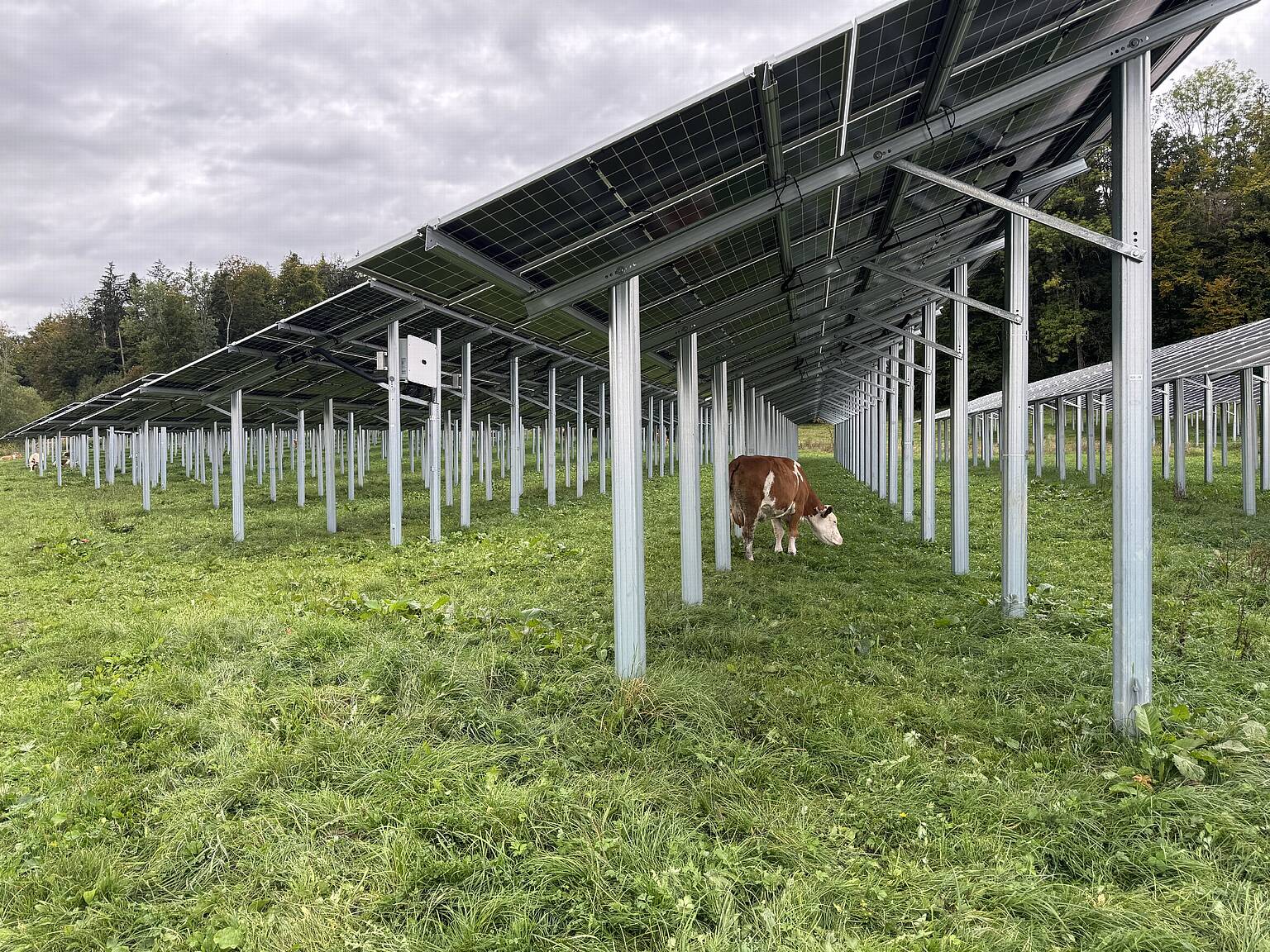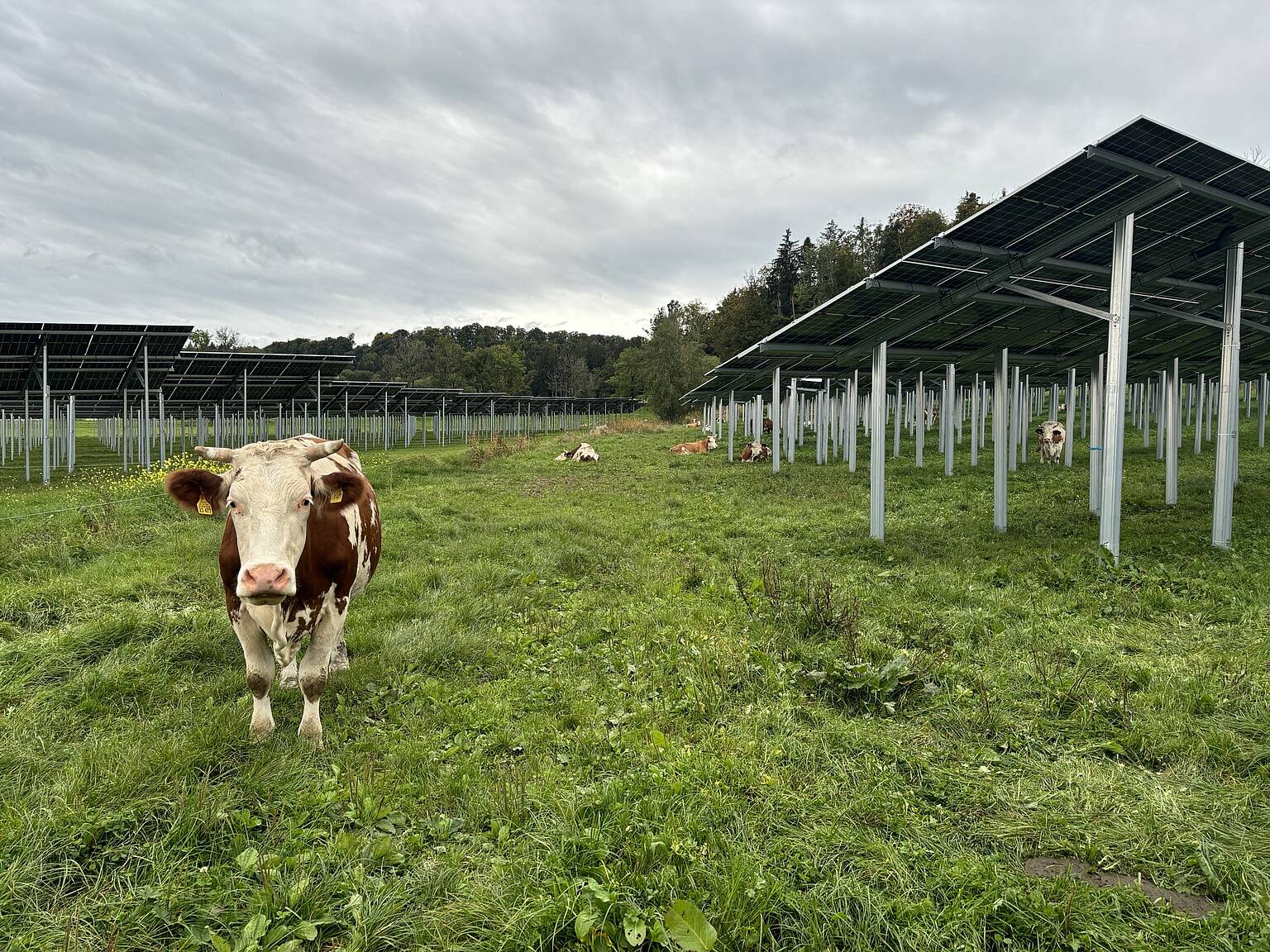 Verantwortlich für die großzügigen Schattenplätze auf der Kuhweide ist die Energiegenossenschaft Oberland – wobei sie natürlich nicht in erster Linie auf das Tierwohl abzielt, sondern auf den Stromertrag aus der PV-Anlage. Agri-Photovoltaik oder kurz Agri-PV heißt das Modell, mit dem Äcker und Wiesen für die Erzeugung von Sonnenstrom genutzt werden können, ohne die landwirtschaftliche Verwendung zu beeinträchtigen. So kommen sich Landwirtschaft und Energiewende weniger ins Gehege, weil bei Agri-PV keine Flächen aus der Agrarnutzung herausgenommen werden müssen.