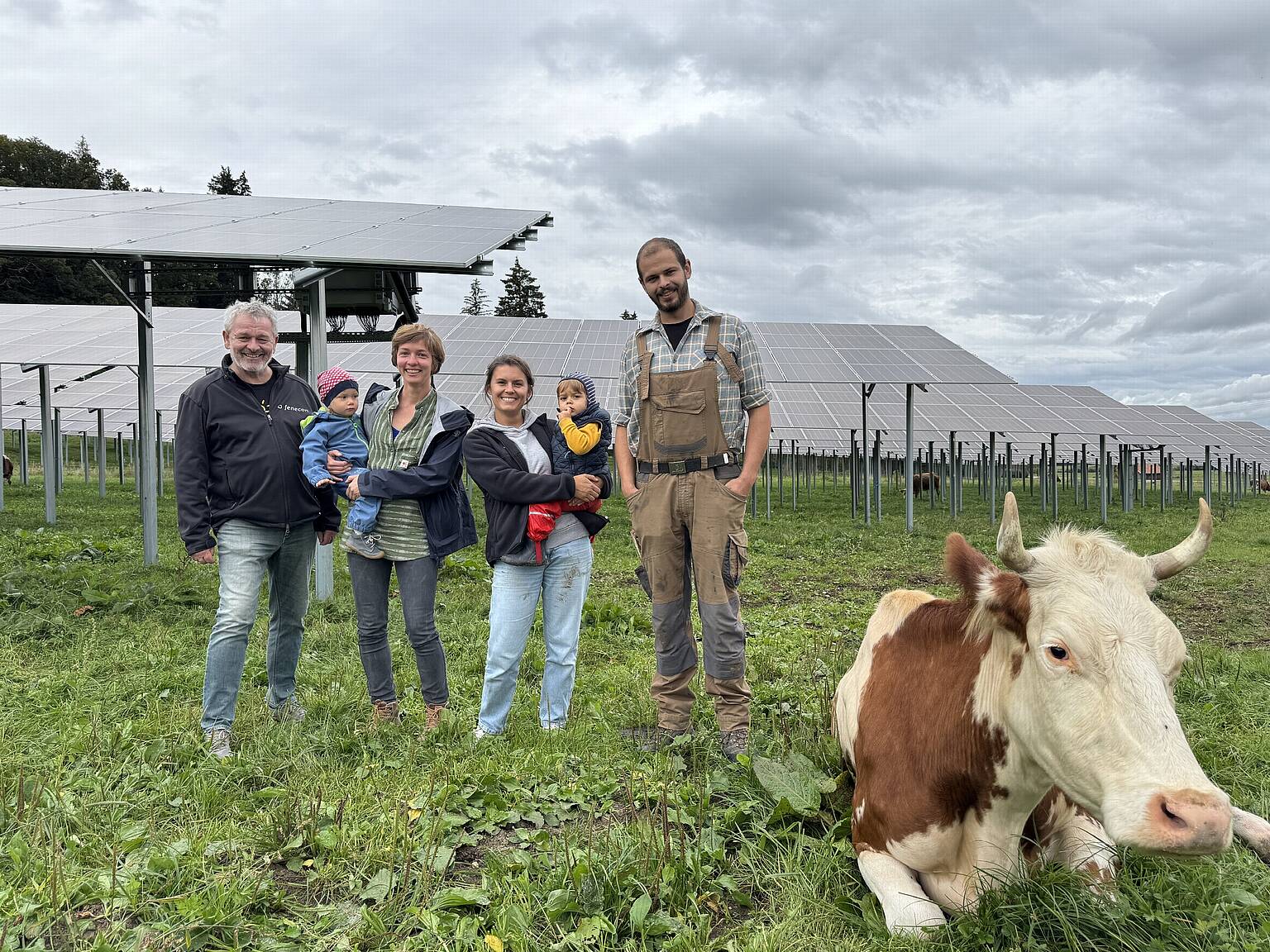 Stolz auf das Vorzeigeprojekt der Energiegenossenschaft Oberland (v. li.): Christof Wiedmann (Genossenschaftsmitglied), Susanne Seeling (Vorständin) mit Linda, Anna Maletz (Geschäftsstelle Energiegenossenschaft Oberland) mit Paul und Landwirt Korbinian Hutter auf der Fläche der Agri-PV-Anlage im Peißenberger Ortsteil Fendt.