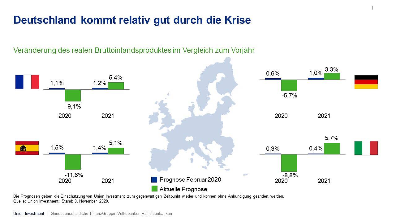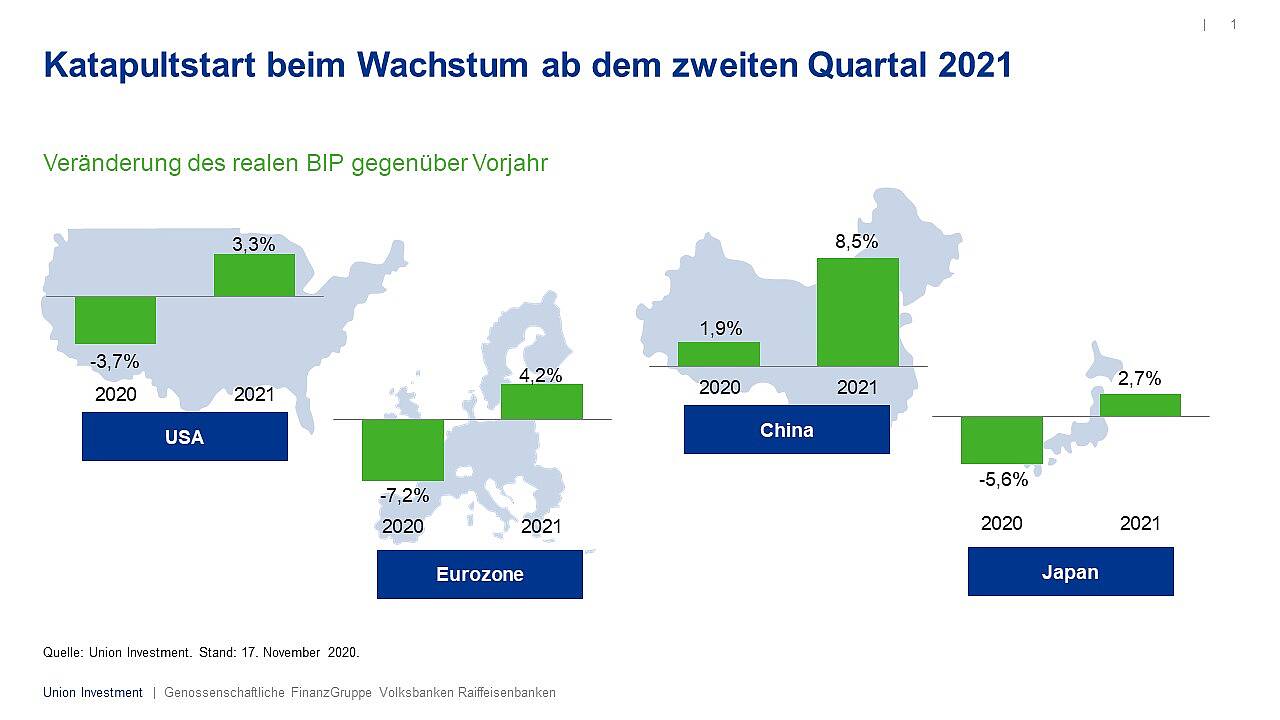 Das Winterhalbjahr 2020/2021 bleibt konjunkturell noch von der Pandemie belastet. Erst im Verlauf des Jahres ist mit einer deutlichen Belebung der wirtschaftlichen Dynamik zu rechnen. Grafik: Union Investment