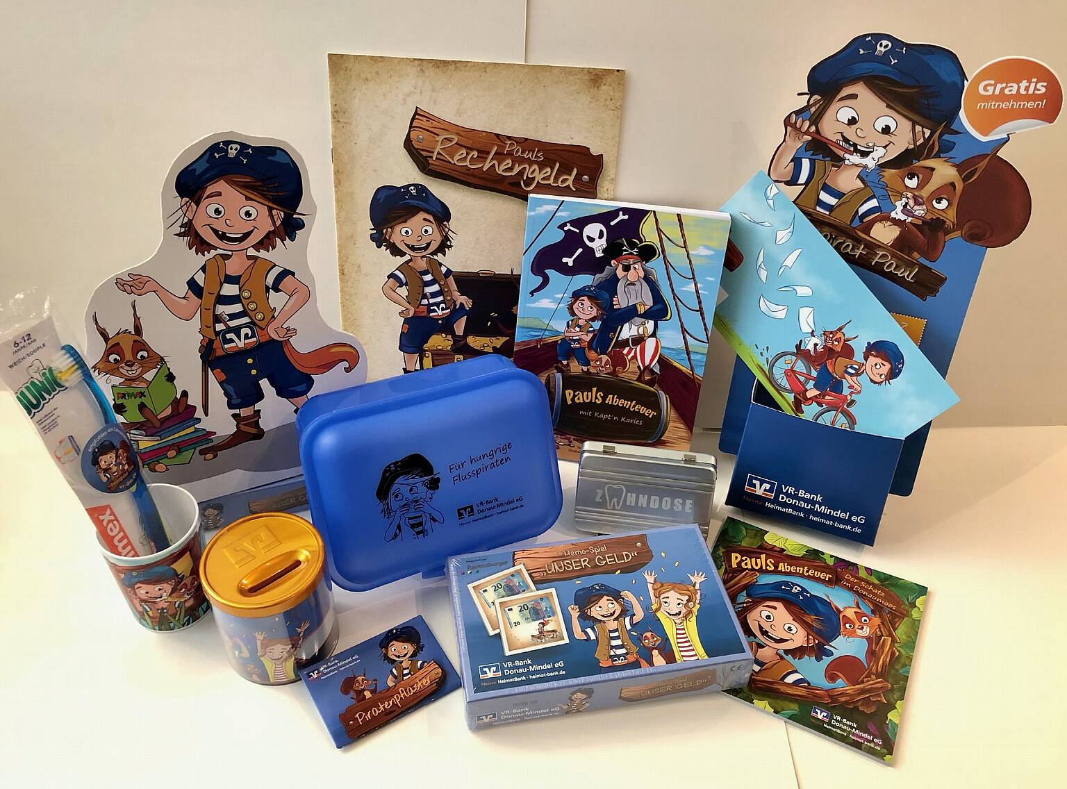 Brotdose, Zahnboxen, Pflaster: Eine Auswahl an Werbemitteln mit Motiven von Flusspirat Paul.