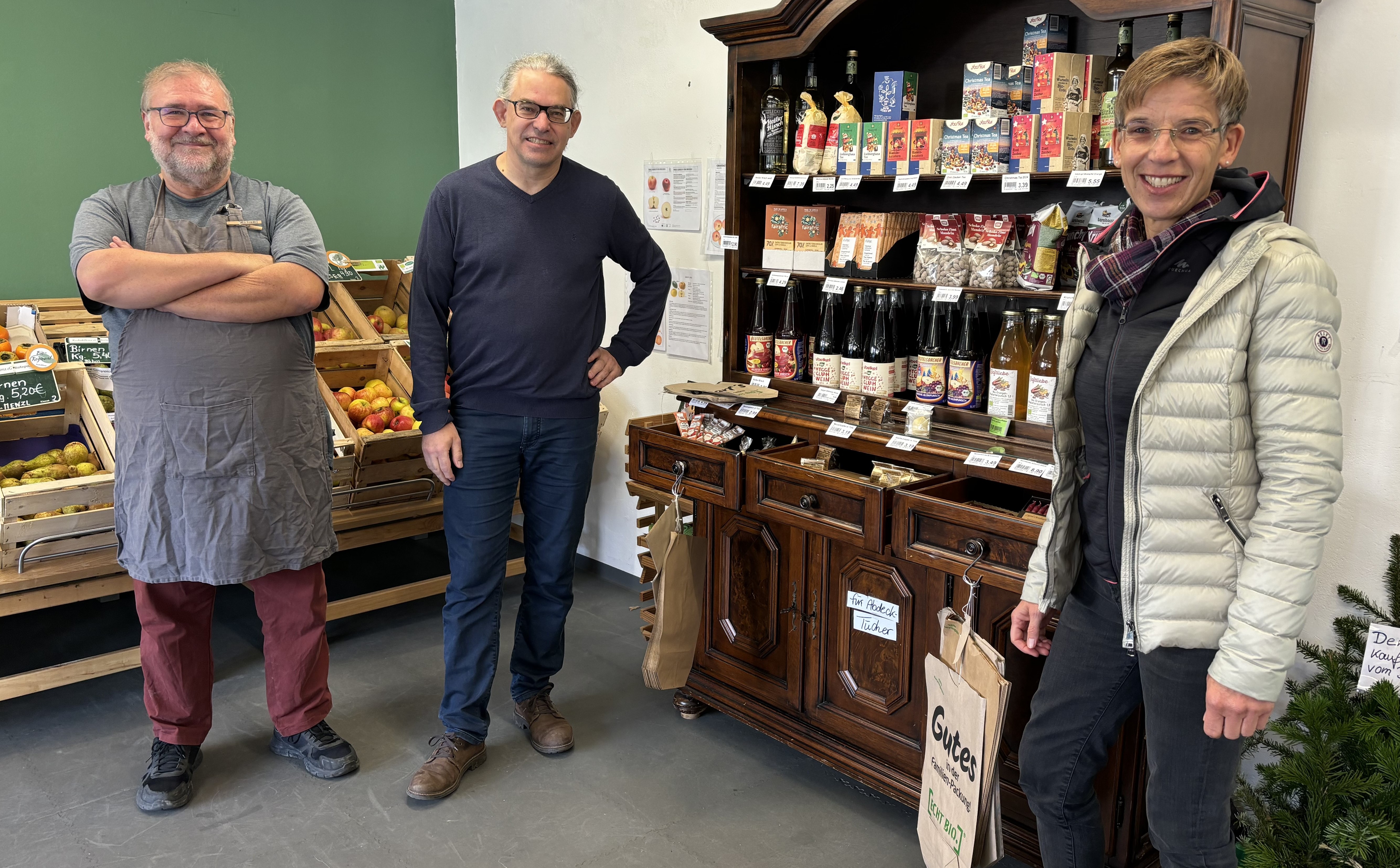Gemeinsam gestalten sie ihren Bio-Hofladen: Mitarbeiter Richard Härtl (v.li.), Vorstand Gero Wieschollek und Mitarbeiterin Andrea Stoldt.